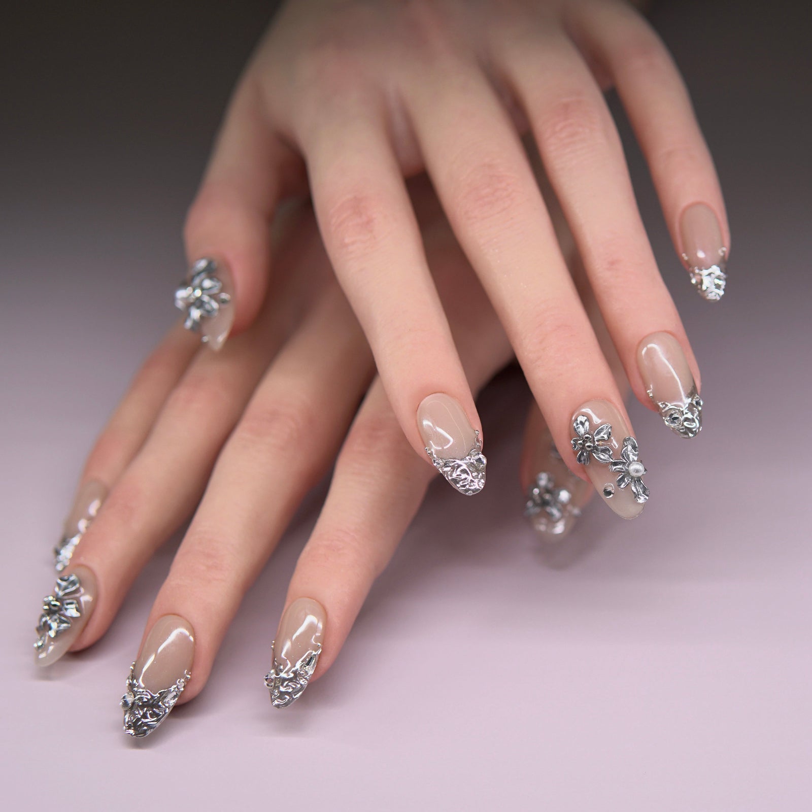 Close-up of large metallic silver floral embellishment on nude nail surface, showcasing detailed carving and pearl-like structure.