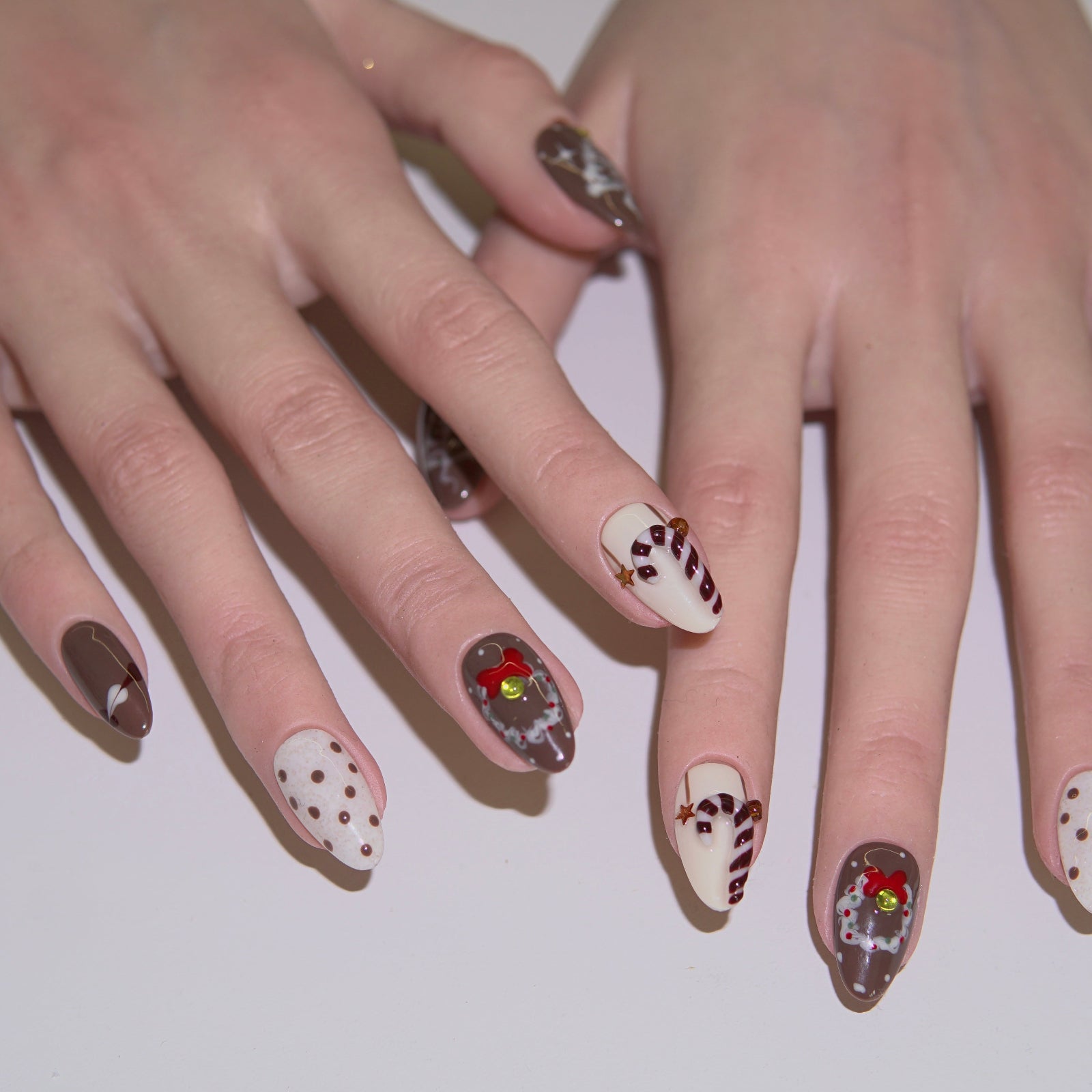 Gingerbread Latte Christmas press on nails in warm coffee browns with tiny gingerbread details and creamy white accents. Gingerbread Latte - Press & Pretty