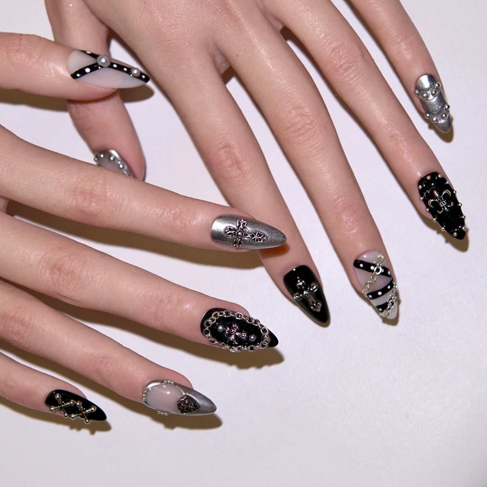 Black, white, and liquid chrome—this set wears like armor. Cross emblems, chain drapes, studded frames and pearl notes turn your hands into midnight statements.