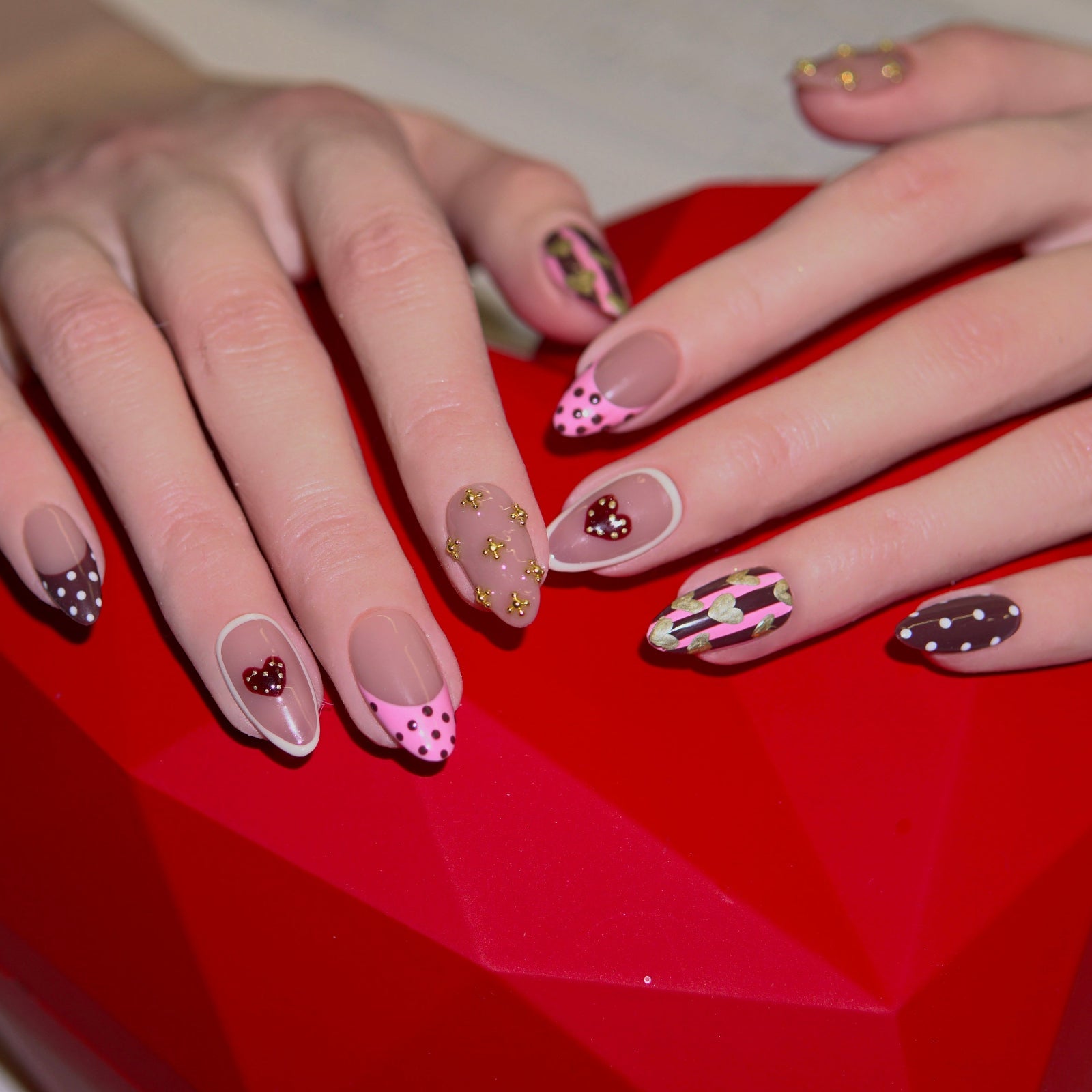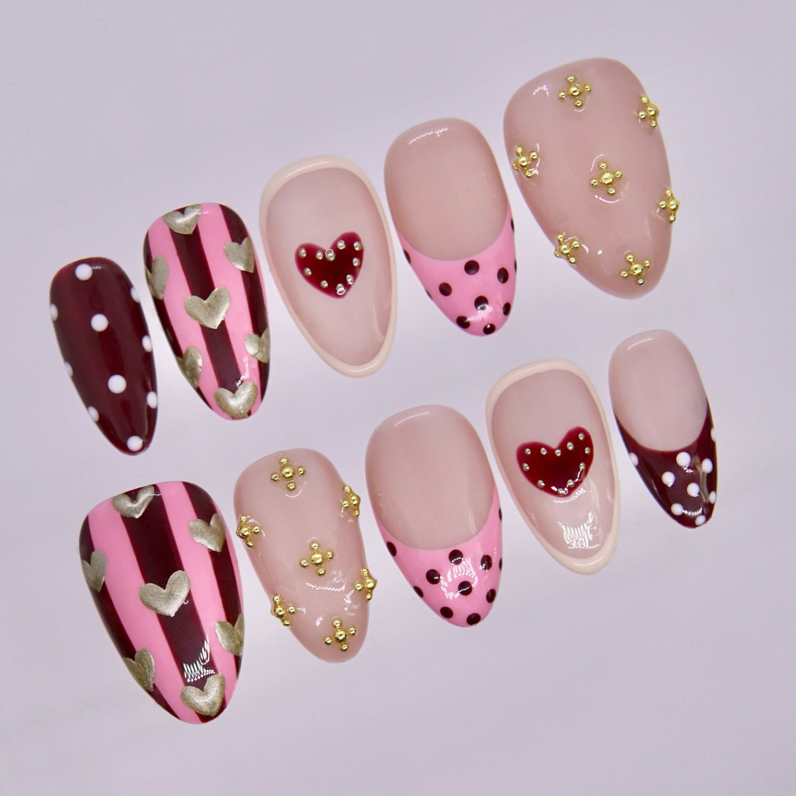 - Blush nude base with bold pink, burgundy, and heart pattern accents