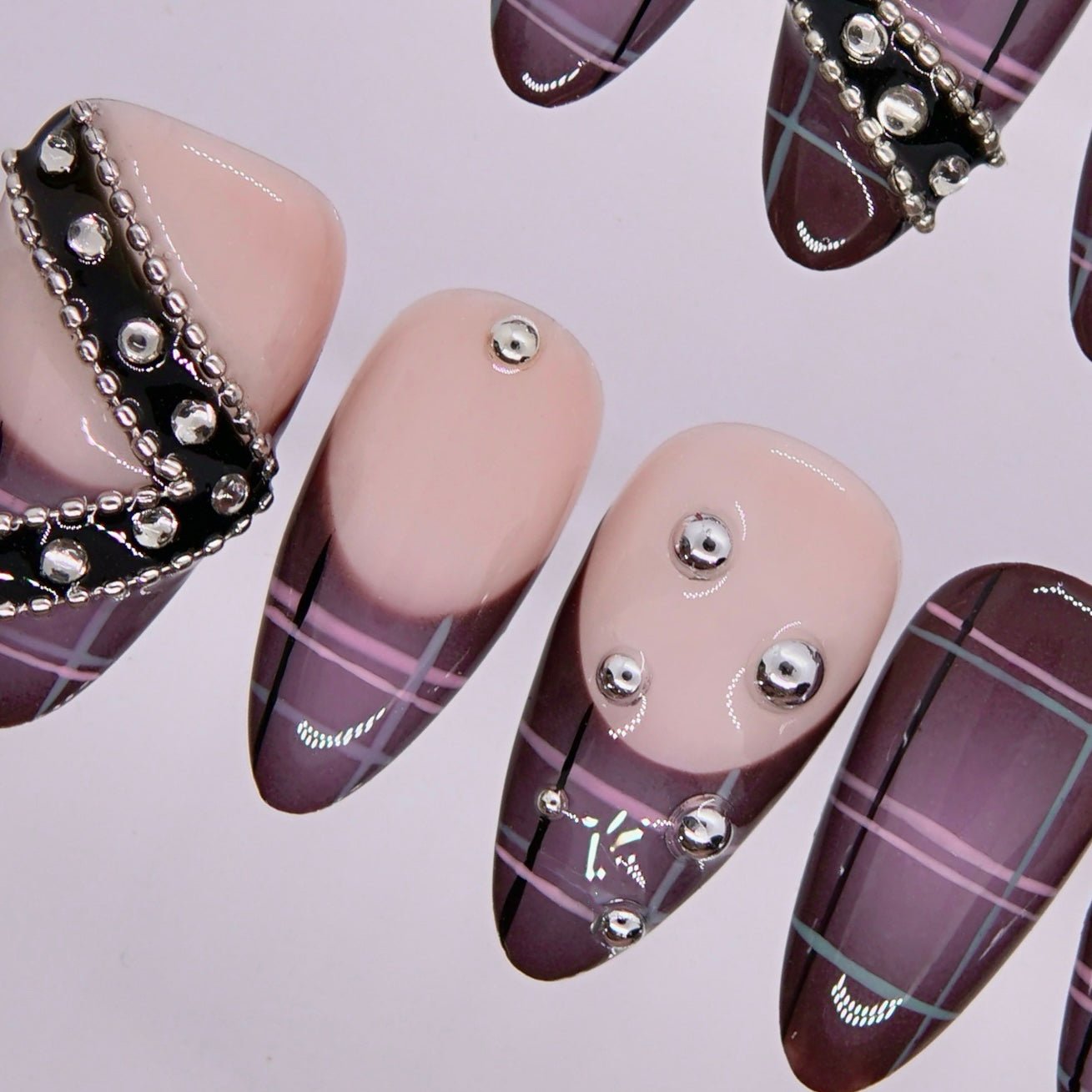 Mocha Rebel press-on nails featuring mauve plaid pattern with silver studs and blush French base.