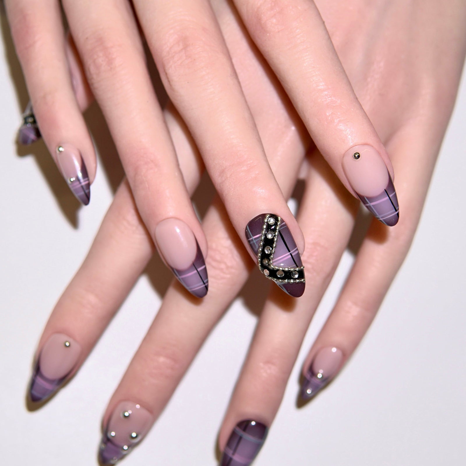 It’s the kind of nail set that orders a mocha but adds an extra shot of attitude. A swirl of mauve plaid, soft blush tones, and silver studs—somewhere between preppy and punk.