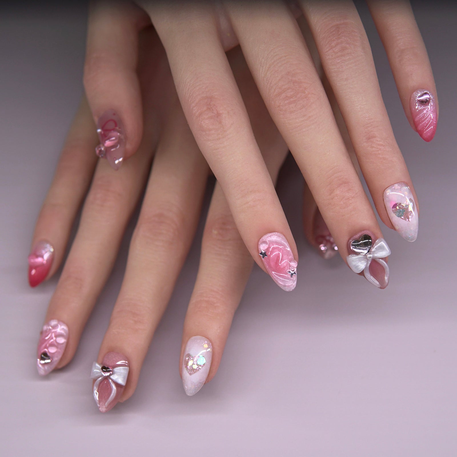 A soft pink gradient like flushed cheeks. Sculpted bows. Little hearts, sparkling like secrets. This isn’t just a nail set—it’s the story of someone who dressed up for love, and maybe for herself too.