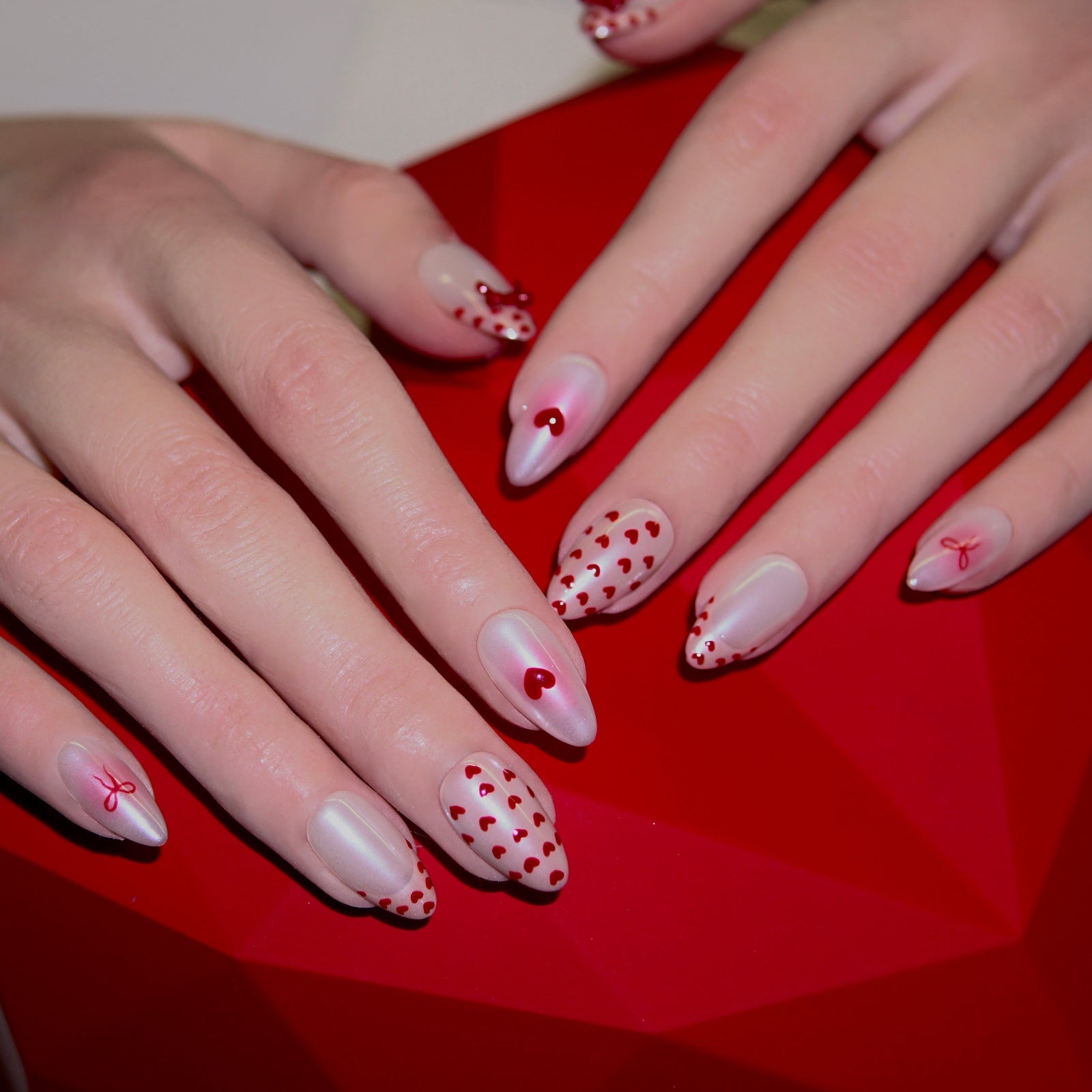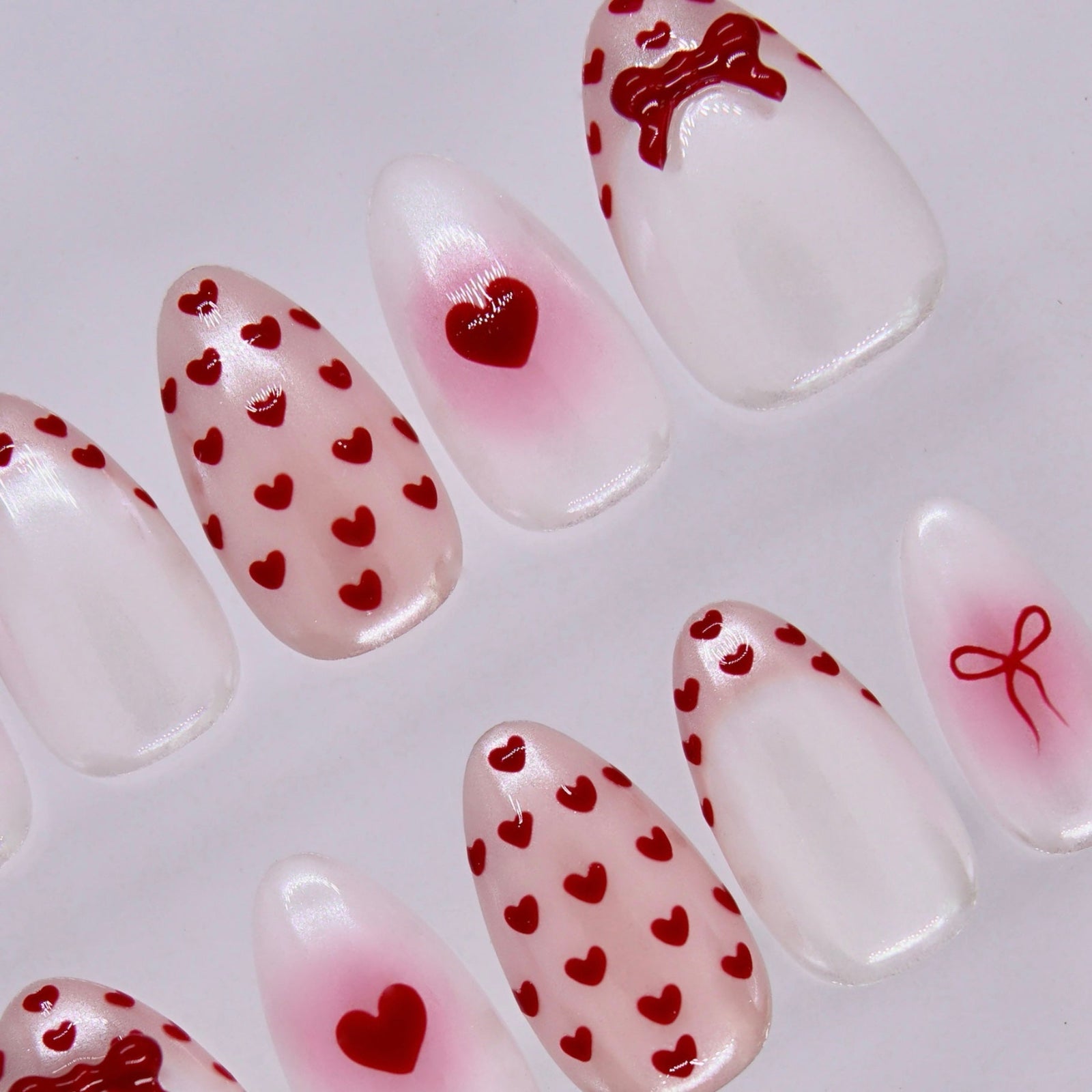 - Soft milky base with red heart and bow details for a gentle Valentine mood