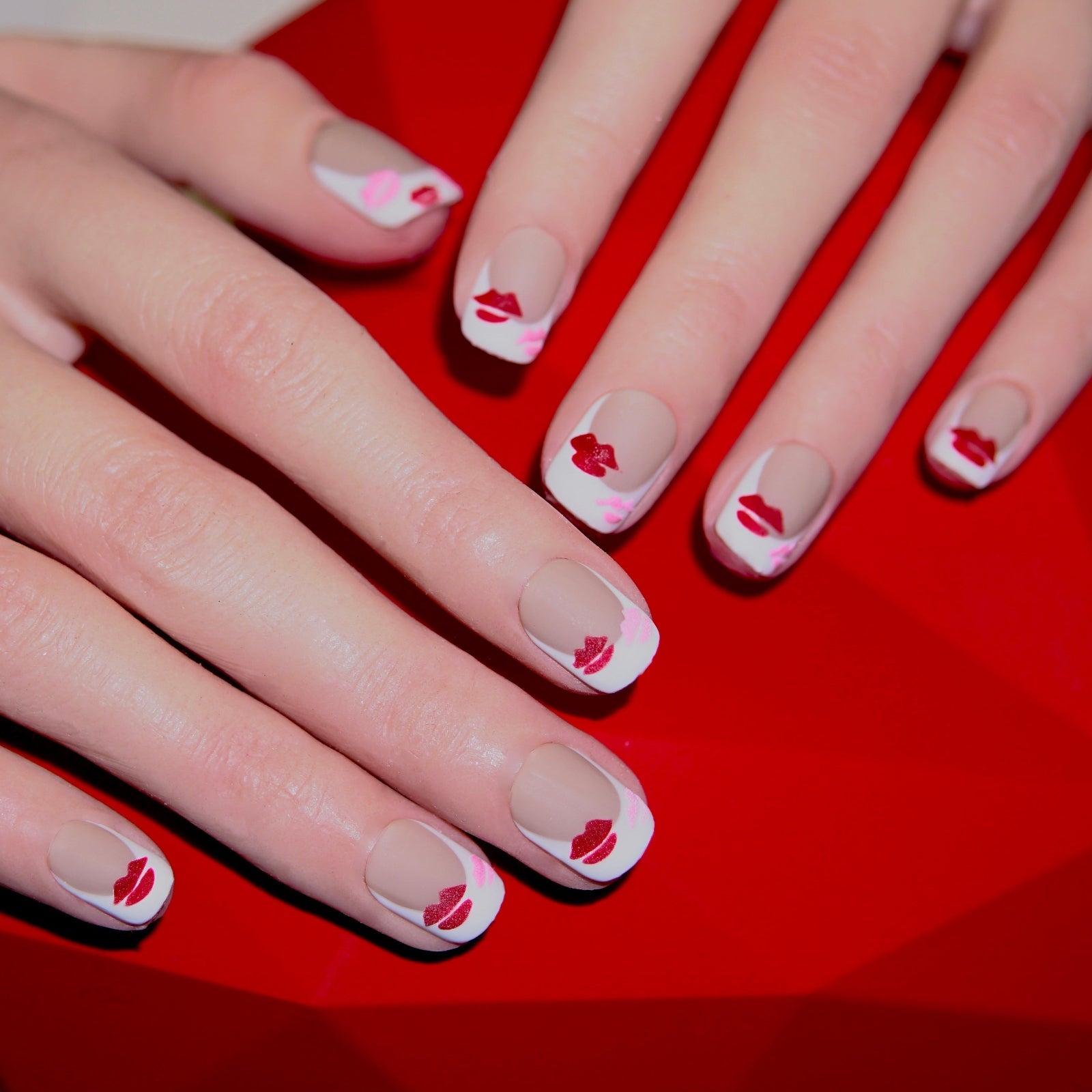 - Soft nude base with playful red and pink lip details for Valentine’s season